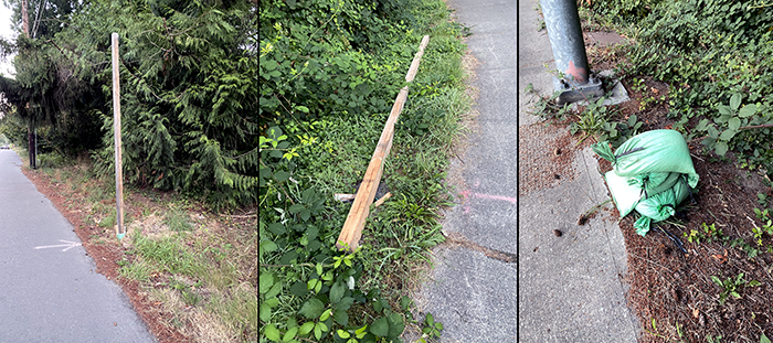 Our route today was partly along the detour for the work on 100th NE Ave. We noticed they removed all the detour signs but left the sign posts and sandbags holding down some of the signs.