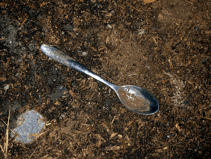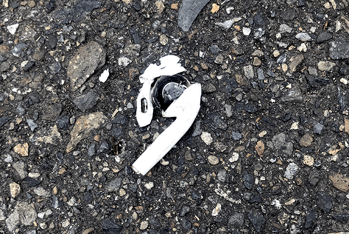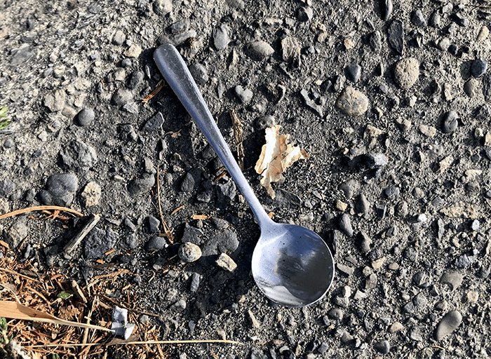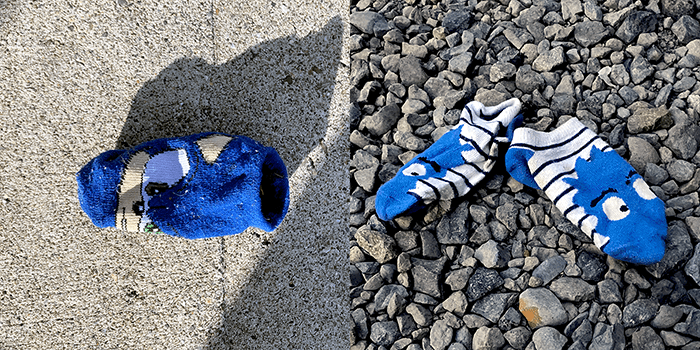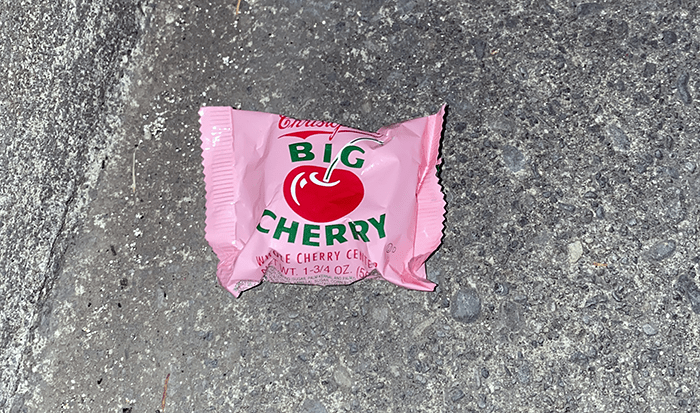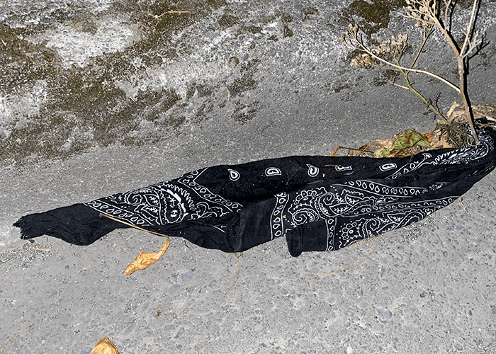 A bandana in good condition laying in the gutter. We’ll wash it and put it in our bandana collection.