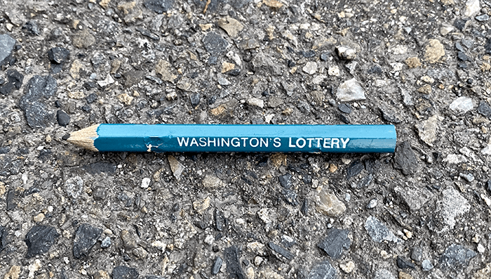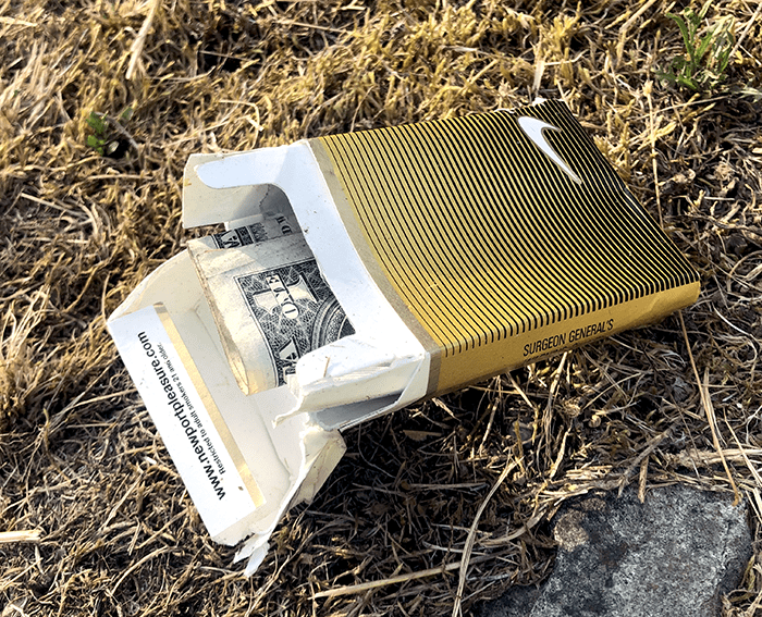 In a discarded cigarette carton, someone left a dollar bill. So, is this a tip for picking up after him? This is actually bad. Now we’re going to have to open every cigarette box we find.