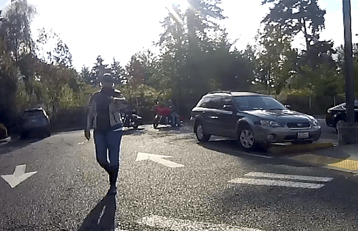 Walking through the park-and-ride we saw a couple sitting on their motorcycles. As we approached, the woman started walking toward us.