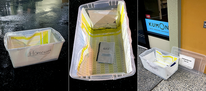 In the middle of a parking lot was a plastic homework bin. Inside was a single waterlogged book. Either they have one student who is not keeping up or enrollment is way down. We returned the bin to the probable business. We expect a good grade for civic responsibility.