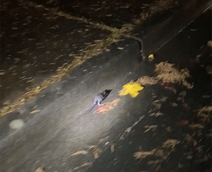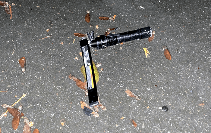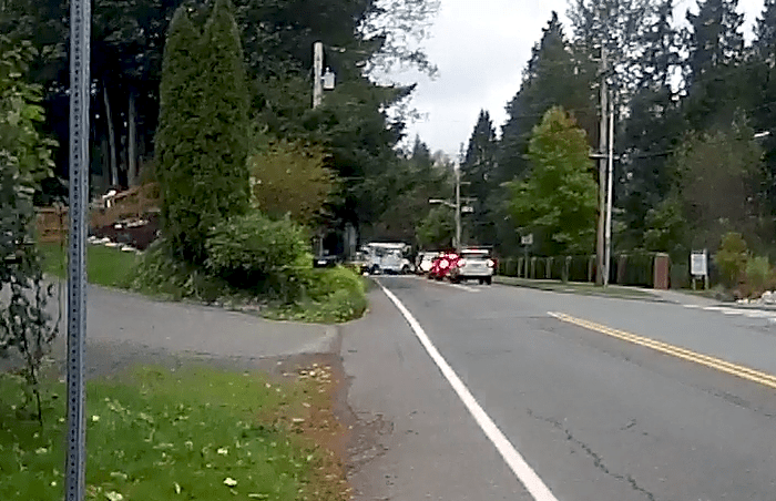 Past the freeways on NE Woodinville Drive, it was still dark and misting heavily. We kicked a small branch off the road down a bank.