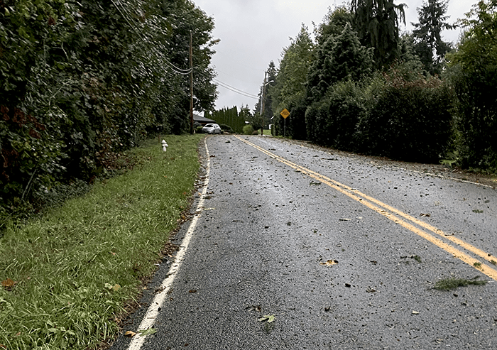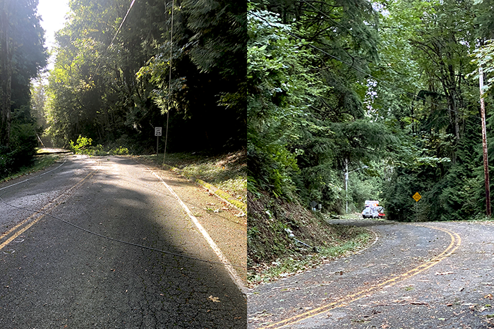 The image on the left is from yesterday after the lines were down looking up the hill. The one on the right is this morning from the bend in the road. The trucks were still there. We took the trail to the Tolt Pipeline and continued down to 112th Ave NE.