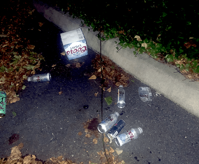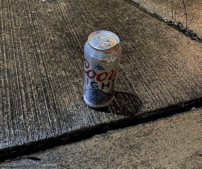 At the park-and-ride, we find a lot of empty Coors beer cans. Whoever is tossing these was thoughtful enough to leave us an unopened one.