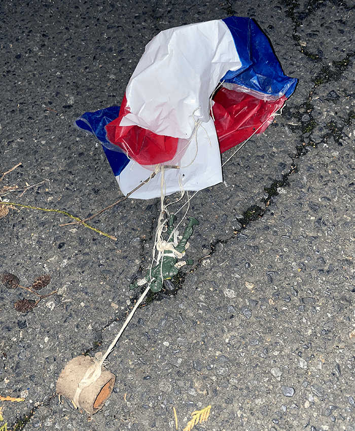 We figure this guy was launched in a rocket, parachuted back to earth, and got caught in a tree. Then, after spending months in the branches, the high winds yesterday caught the chute and dumped him on the ground. He probably didn’t lose his underwear, but they cannot be in decent shape.