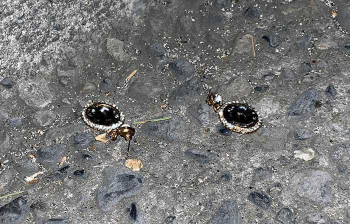This is what happens when you jog and try to put on your earrings at the same time, you lose your paste. We assume they’re paste. If not, these are worth about $20K. We better check.