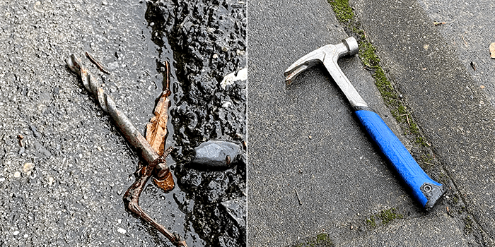 We picked up a drill bit. But it was broken. The hammer is a Kobalt 16-oz Smooth Face Steel Head Steel Rip Claw Hammer. The hammer was in much better condition than the drill bit, it was only slightly bent. It might be good for hammering around corners. On the other hand, according to the website, it has a lifetime guarantee. Wonder if it covers being runover.