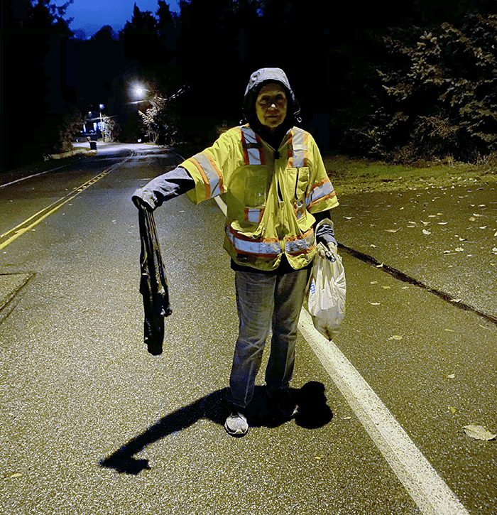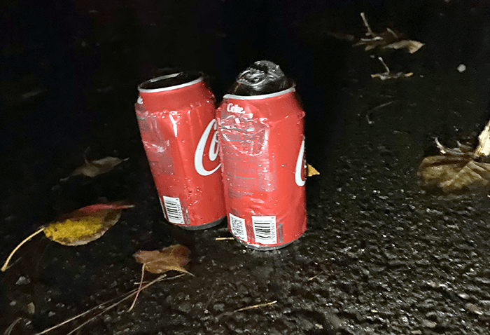 We often check a steep gully where people toss cans and bottles. When we see five cans, we journey down the bank to collect the containers.