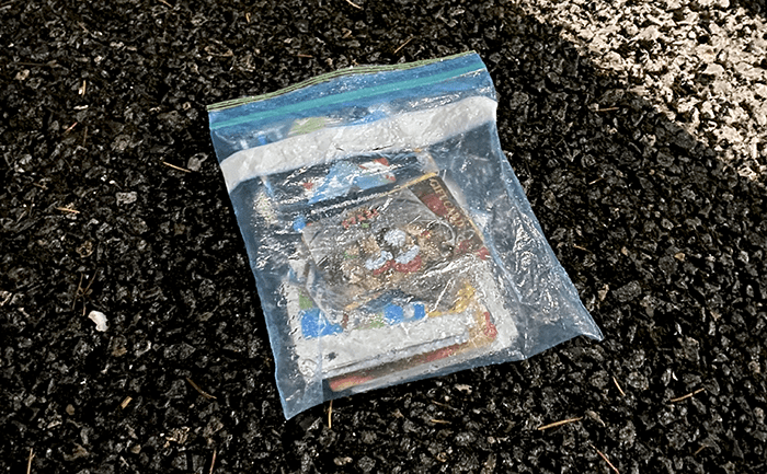 Finally, at the P&R, we found a Ziplock bag with a stack of cards in it.
