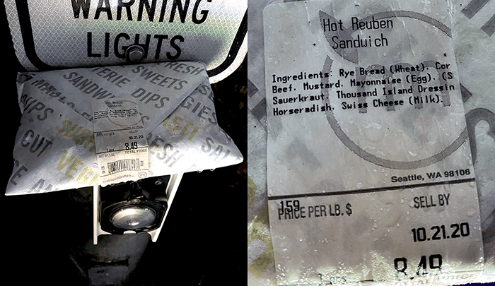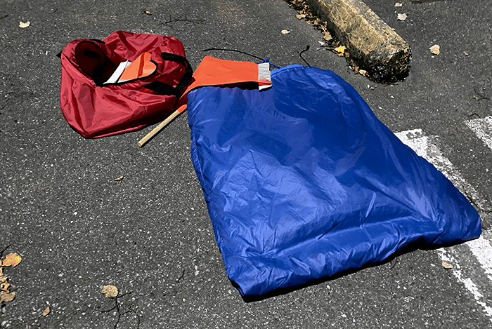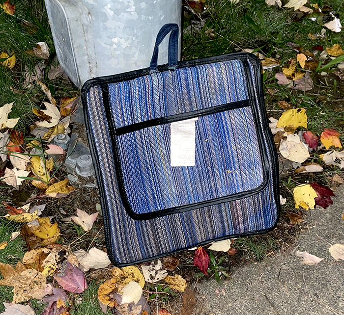 At the park-and-ride, we found a duffle bag with a sleeping bag, some socks and two road-crossing flags.