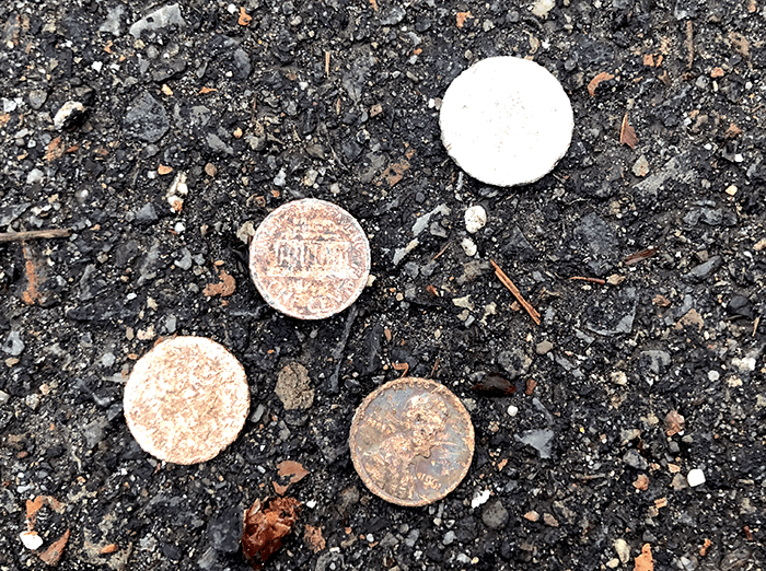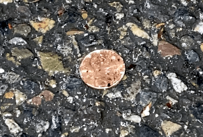 Today, we found two more. One in a service station parking lot and the second a block away by a strip mall. We’re up to seventy-six cents this week for only ten hours of walking. We can’t wait to see what tomorrow brings!