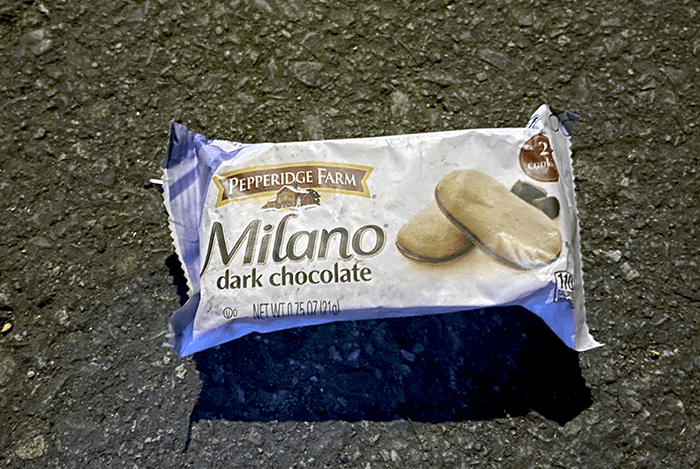 Someone left us an unopened package of Milano Dark Chocolate Cookies. Wait, make that Milano Dark Chocolate Cookie Crumbs.
