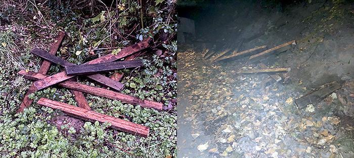 During this week’s walks over Norway Hill, we saw four piles of dumped lumber like the one on the left, plus random scattered pieces. Today, we found two more piles along Riverside Drive and Woodinville Drive. In all, we estimate there were over sixty pieces of wood complete with rusty nails. Someone had some work done and paid to have the wood hauled to the dump. Hope he didn’t pay much.