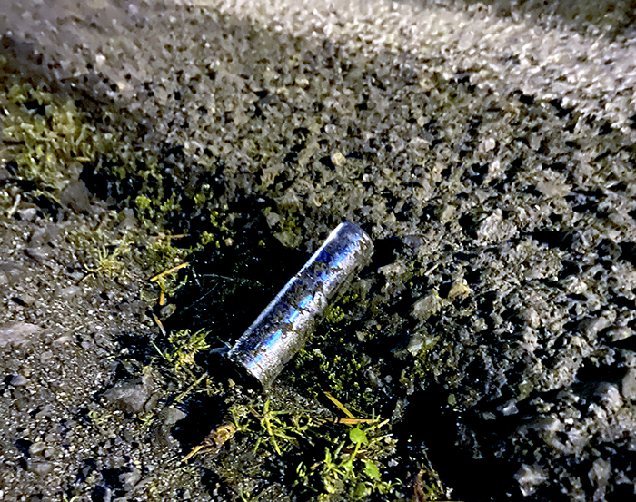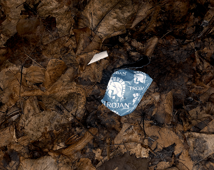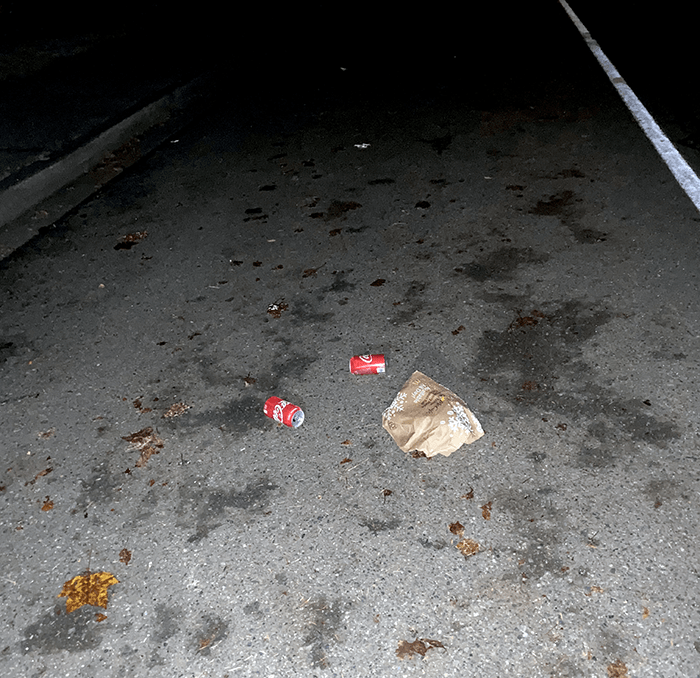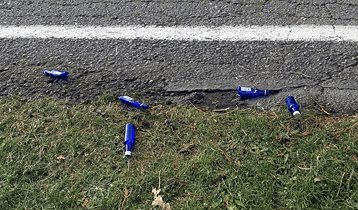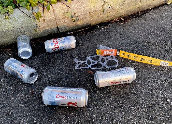 Five empty Coors cans and a smoked sausage wrapper. After all, you can’t drink five beers on an empty stomach. We figure the sixth beer is for the ride home. We’ll probably find it along the road somewhere.