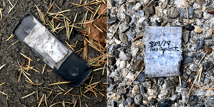 When we got it home, we opened the bag and found a very wet folded piece of paper with some writing on the outside, “9/29/18 Two Cyclists.” We carefully unfolded the paper and found it was the log from a Geocache micro cache.