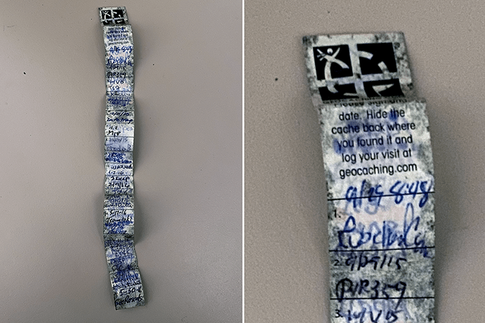 Geocaching is like a treasure hunt using GPS coordinates. The log was difficult to read but based on where it was found, we were able to match some of the entries with a nearby cache’s online log. We sent a message to the owner to notify him that his cache had been compromised. He got back to us saying what we found was an old cache that the real owner had removed. So it wasn’t a micro cache after all. It was a piece of trash.