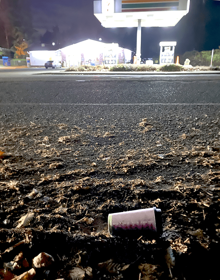 At the bus stop across from the 7-Eleven, we picked up a littered 7-Eleven cup.