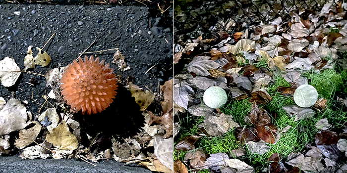 We found a dog ball(?) that bears an uncanny resemblance to the COVID-19 virus. We also found two tennis balls outside the KinderCare. We each picked one up to toss over the fence. Chuck’s went further. She throws like a girl. I know, not PC, but get over it.