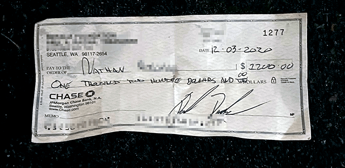 Well, not really, it is a $1200 unendorsed check. These days you can deposit using a photo of the check, so we don’t know if Nathan deposited it or not. The check was from a foundation that provides scholarships to people with a certain cultural background. It didn’t match either of our backgrounds, so we mailed it back to the foundation.
