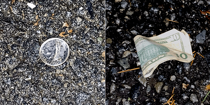 A penny by a bus stop in Bothell and a nickel on Brickyard Road. With the money we found on Tuesday, we gathered a total of $10.16 this week. Even without the ten dollar bill, we haven’t made more than this since the week of October 19th when we garnered eighty-four cents.