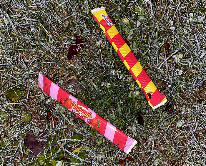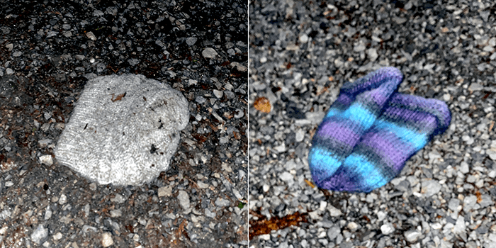 We hung them on a sign. Today we found that someone had tossed them in the bushes. We hauled them about a mile to a trash receptacle. People.