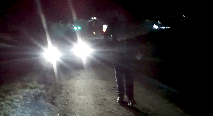 As we walked along Juanita-Woodinville Way, a car pulled over and stopped. All we could see was the glare of headlights.