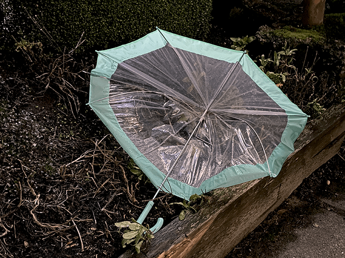 Someone probably opened the umbrella indoors. It’s probably not fixable and there was a recycle bin behind a nearby bank where we deposited it.