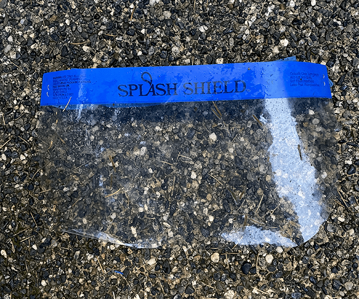 We pick up several discarded or dropped masks each week. Today we found four. But this is the first face shield we’ve found.