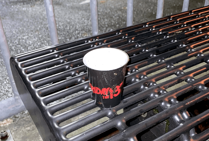 At a bus stop in Bothell we found a “Friday the 13th” plastic cup.
