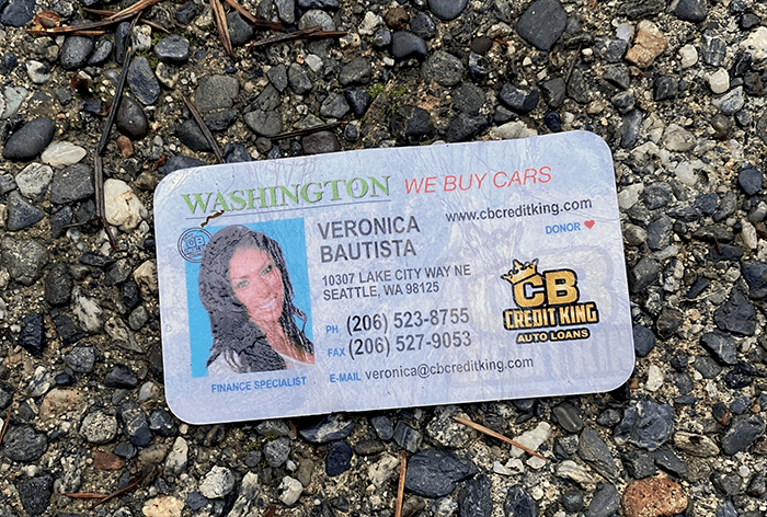A quarter on NE 145th St. It appeared to have some dried glue or epoxy on it. Someone must have tried the glue-the-quarter-to-the-sidewalk prank. This WikiHow article explains in great detail how to perform the prank. One of the steps instructs you to make sure the superglue is on the correct side of the coin then stand on it for a minute to ensure it’s set. Right, otherwise you are performing the glue-the-quarter-to-your-shoe prank