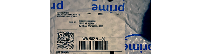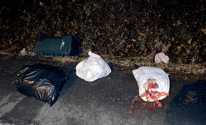 A garbage can in the ditch with its contents spilled out. There are side streets off this road, but no houses along the road. We pulled the can and garbage bags out of the ditch. While loading the can with the bags, we found an Amazon shipping envelope with an address.