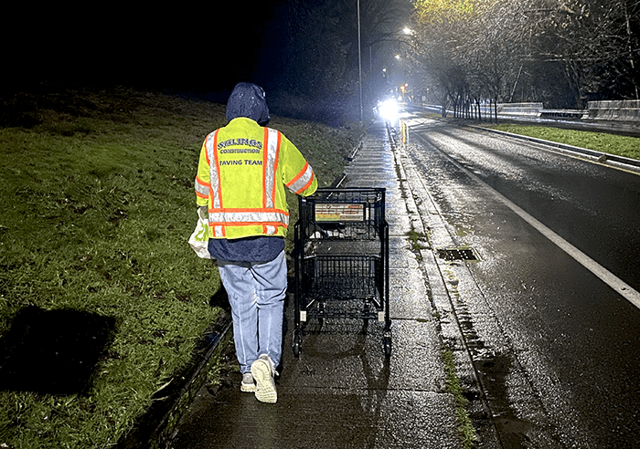 At a bus stop on Juanita-Woodinville Way NE, we saw an abandoned Safeway shopping cart across the street.