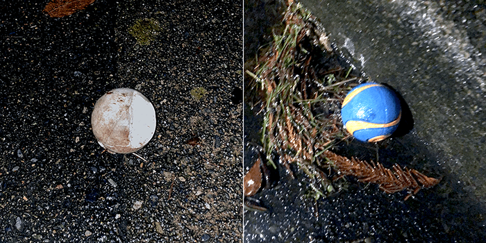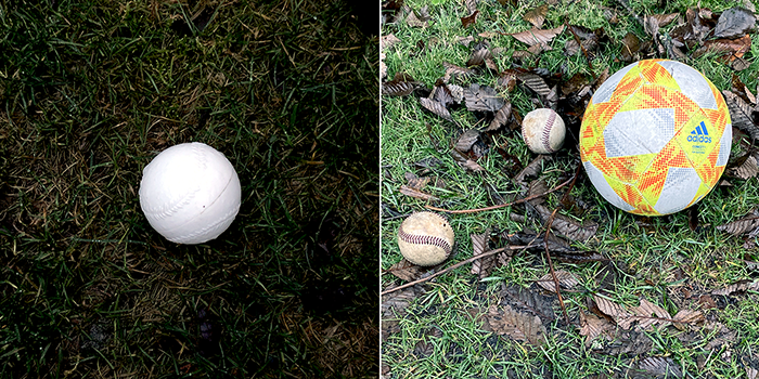 The one on the left was a plastic baseball outside a fence on Brickyard Road. We tossed it back. Across from a school near the end of our walk, we saw a soccer ball in the blackberry bushes. As we fought our way to the soccer ball, we spotted two baseballs. We tossed all three back into the field. So we came home without any balls. [Note to self: rephrase this before publication]