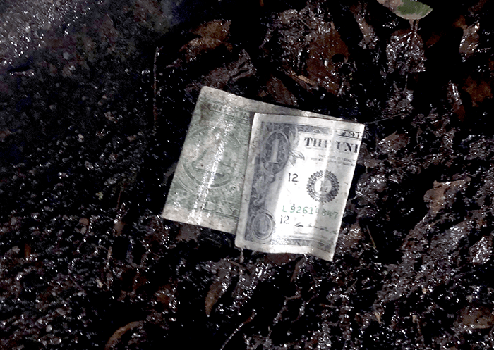 We found a soaked dollar bill in the gutter along 100th Ave. Whoop!