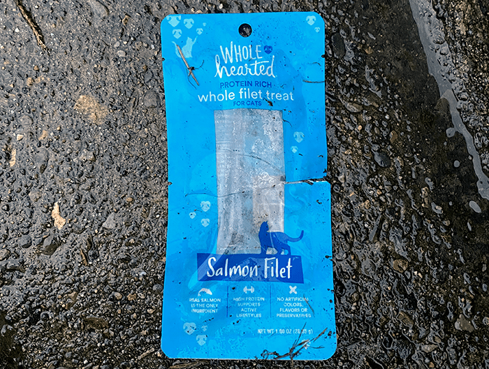 Salmon Filet, Protein-rich. This sounds good. We should buy some to carry on our walks. Oh, never mind. It’s for cats.