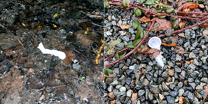The condom on the left was in the Sammamish River parking lot and the other was at the park-and-ride. Near the first condom was a bag.
