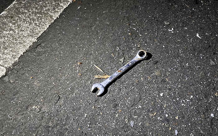 A 10-mm combination wrench. It was not run over and now resides in our found tool collection.