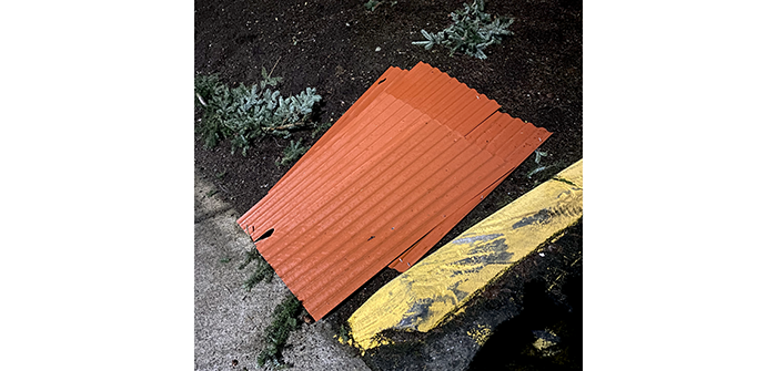 Near Safeway, we picked up several orange sheets of fiberglass roofing scattered by the wind.