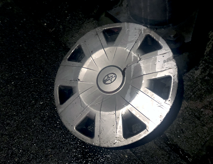 We found a damaged Scion hubcap.