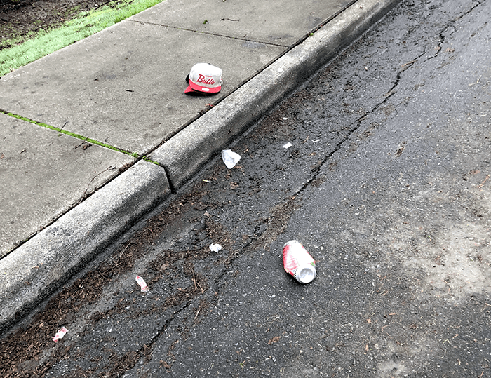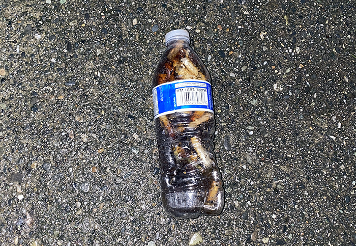 A water bottle filled with water and cigarette butts and tossed into the weeds. What are these people thinking? “I don’t pollute by randomly tossing my cigarette butts out the window, I put them in a plastic water bottle so I can pollute the water, ruin a recyclable bottle and still ultimately pollute with my butts.” Yes, you win the Trash Trifecta.
