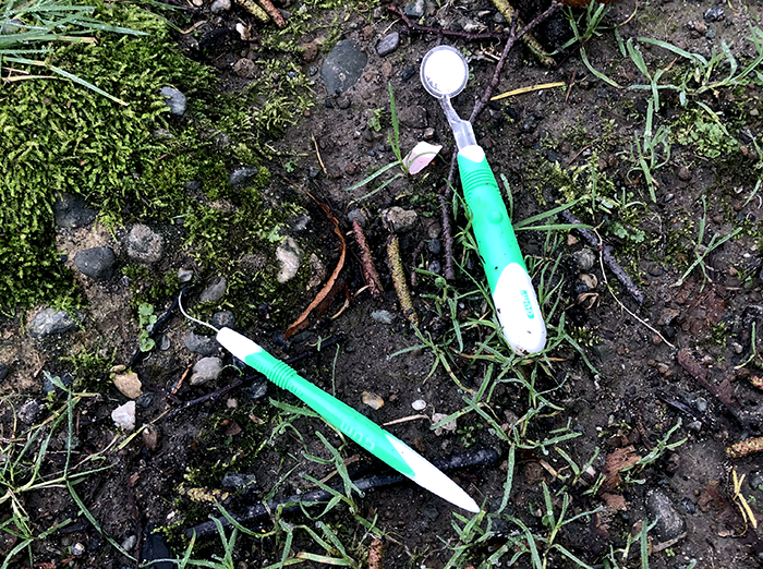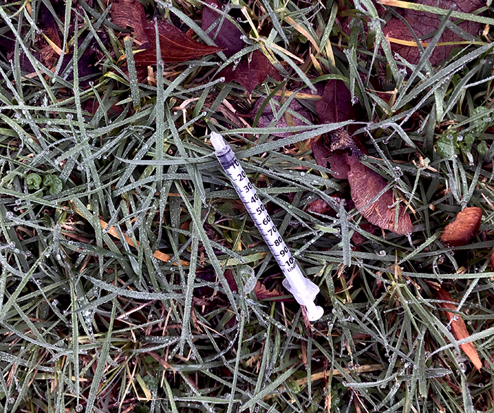 As we were picking up the trash, we spotted a needle in the grass.