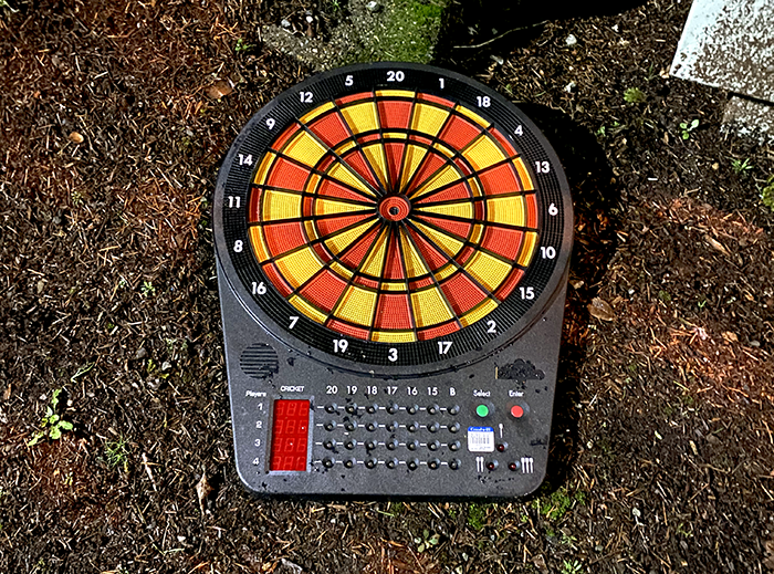 Oops, no darts. It has a price tag, $12.99 from Goodwill. Guess the darts were extra.