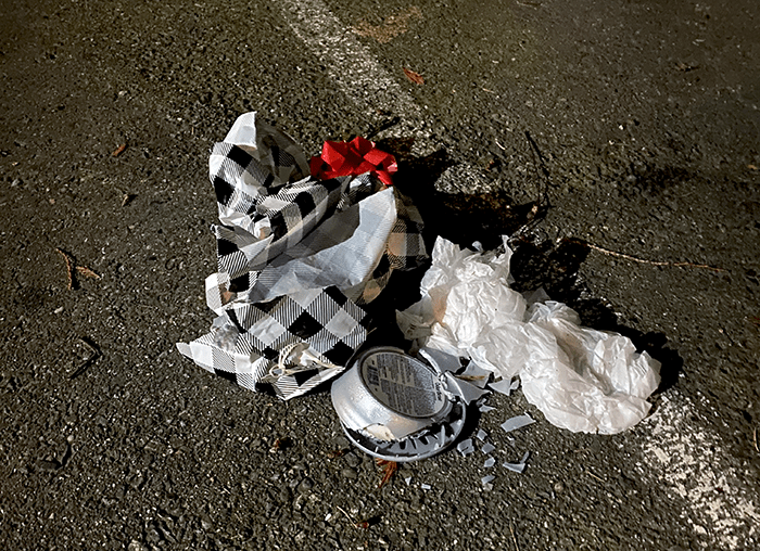 There was also a smashed air freshener. “Honey, thank you for another air freshener for our second anniversary. The first one lasted a whole year.” We didn’t find any used condoms nearby.