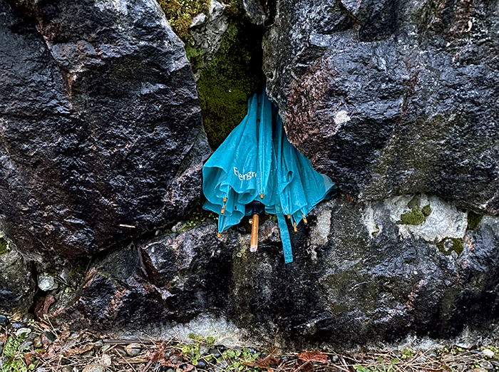 It was from Evergreen Health. It should be ever-green, not ever-blue. It seemed perfectly good except for the missing handle. A few years ago, Evergreen Hospital went into lockdown when security cameras mistook an umbrella with a sword-shaped handle for a gun. Maybe they only provide umbrellas without handles now.