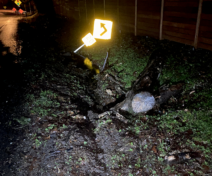 She moved a tree trunk and took out a road sign. If she had been there two hours earlier, she might have taken us out along with the sign. This street is a 35 mph straight residential street. We are guessing texting was involved.