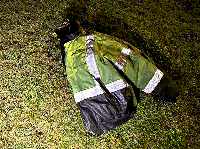 It was waterlogged and heavy. We left it hanging on a post for the owner to find. During the winter months, we wear undershirts, a vest and neck gator for warmth, a raincoat with hood for waterproofing and a light-weight vest for visibility. Maybe we should get a couple of these. It would cut down on dressing in the morning.