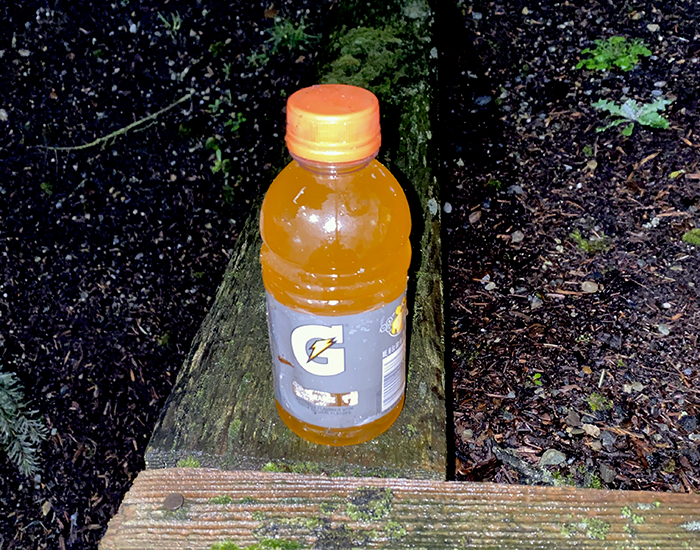 An unopened bottle of Gatorade. Not literally refreshing because we opened it and dumped it out, but refreshing in that we normally find these filled with water and cigarette butts.
