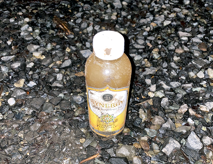 This week folks have left us two beers, a bottle of Gatorade and now, a bottle of Synergy Organic Golden Pineapple Kombucha. We are not familiar with Kombucha, but Wikipedia states that it’s a mixture of “Tea, sugar, bacteria, yeast” with variants adding fruit juices, pineapple in this case. So, where does the bacteria come from? Do they start with dirty bottles?