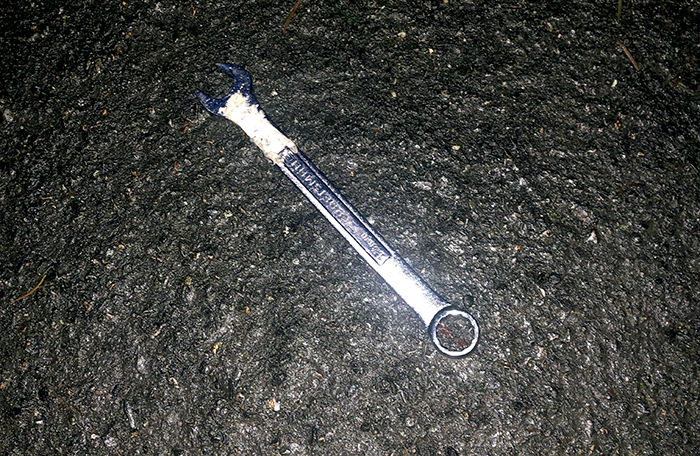 A Craftsman 13 mm combination wrench. It doesn’t appear to be run over at all which makes it unique in our “Found Tool Collection.” At least those found on the street.