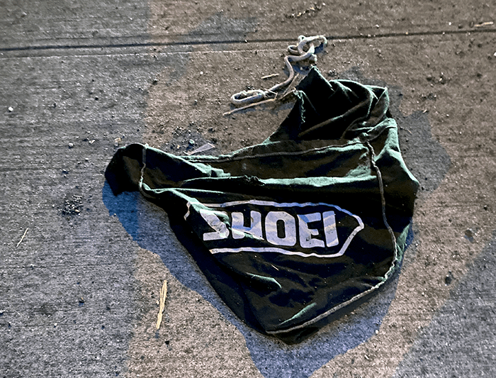 We found it was a motorcycle helmet bag. However, it was no longer available on Amazon. Perhaps riders were not removing the bag when riding?